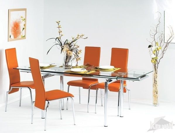 Nawet jeśli na co dzień jadamy sami, lubimy być przygotowani na spontaniczne wizyty niespodziewanych gości. Ważne jest zatem, aby meble (których potrzebujemy zaledwie kilka razy w roku) nie zawłaszczały zbyt dużo miejsca. Praktycznym rozwiązaniem tego dylematu będą stoły z funkcją rozkładania, np GD (Signal). Prostokątny blat wykonano z przezroczystego szkła, dzięki czemu słusznych rozmiarów mebel sprawia wrażenie delikatniejszego i nieco mniejszego. W skład zestawu wchodzi 8 krzeseł, co umożliwia wspólne pałaszowanie w licznym gronie rodziny i znajomych. Jednolita tapicerka w zdecydowanym kolorze nadaje kolekcji nowoczesnego, zdecydowanego charakteru.